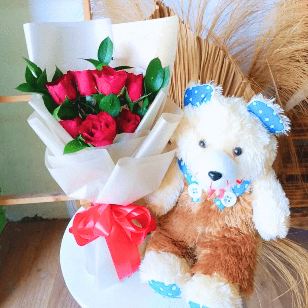 Rangkaian bunga mawar, daun ruskus dan boneka teddy. Dirangkai dengan wrap premium. Cocok untuk diberikan kepada pasangan/atau orang terdekat sebagai hadiah ulang tahun, wisuda, anniversary, dan momen lainnya.