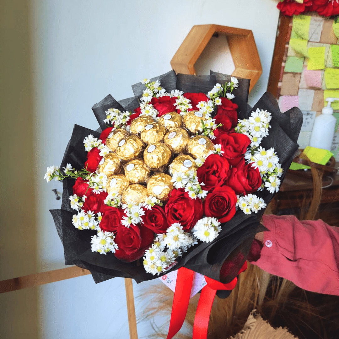 Rangkaian bunga mawar, pikok, dan coklat fererro. Dirangkai dengan wrap premium. Cocok untuk diberikan kepada pasangan/atau orang terdekat sebagai hadiah ulang tahun, wisuda, anniversary, dan momen lainnya.
