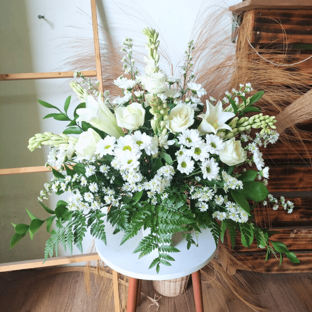 Rangkaian bunga mawar, lily putih, krissan, sedap malam, pikok, daun ruskus dan liderlief. Dirangkai dengan vas kayu. Cocok sebagai hadiah ulang tahun, hari Ibu, anniversary, grand opening dan momen lainnya.