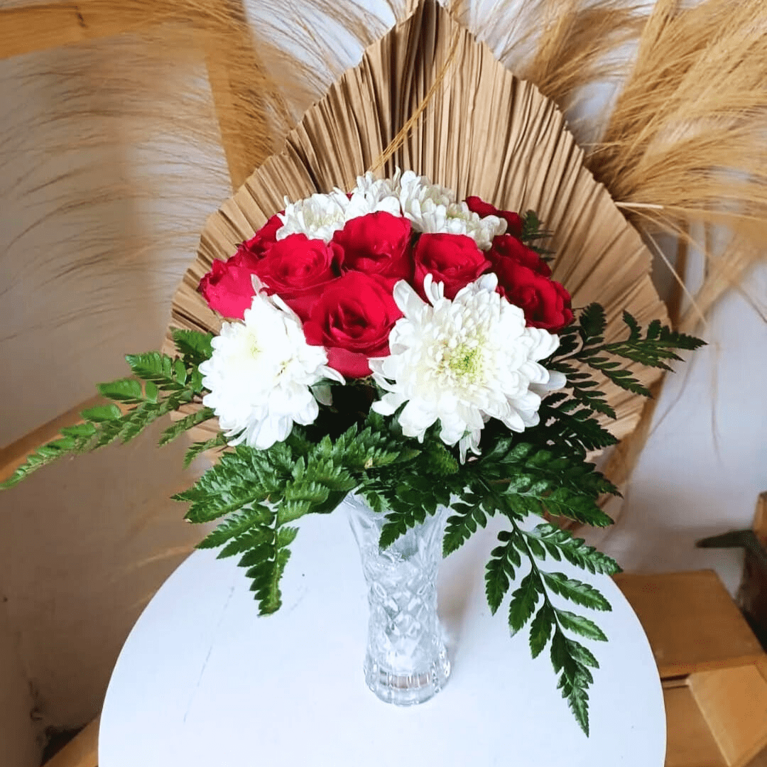 Rangkaian bunga mawar, krisan dan daun liderleaf. Dirangkai dengan vas kaca. Cocok sebagai hadiah ulang tahun, hari Ibu, anniversary, grand opening dan momen lainnya.