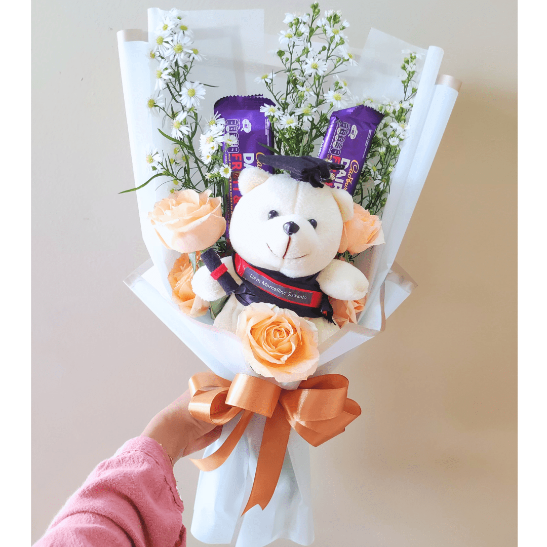 Rangkaian bunga mawar, pikok, coklat dan boneka wisuda. Dirangkai dengan wrap premium. Cocok untuk diberikan kepada pasangan/atau orang terdekat sebagai hadiah wisuda.