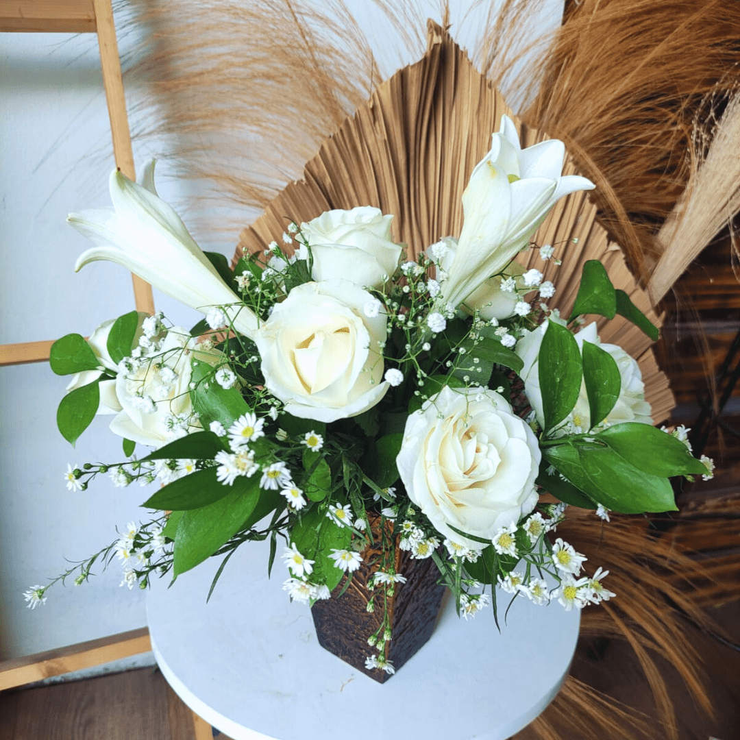 Rangkaian bunga mawar, lily putih, dan babybreath. Dirangkai dengan vas kayu. Cocok sebagai hadiah ulang tahun, hari Ibu, anniversary, grand opening dan momen lainnya.
